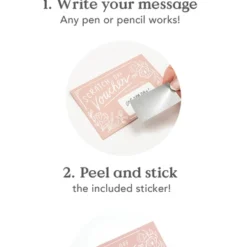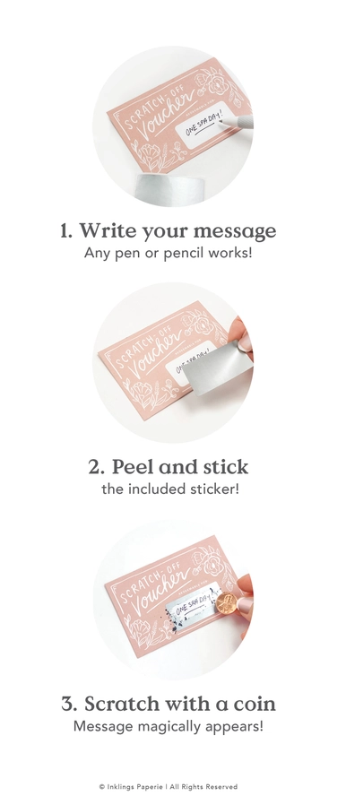 Skriv ditt meddelande eller pris på den blanka ytan på kortet. Täck sedan med det medföljande skrapklistermärket. När mottagaren skrapar med en mynt avslöjas ditt hemliga meddelande eller gåva.