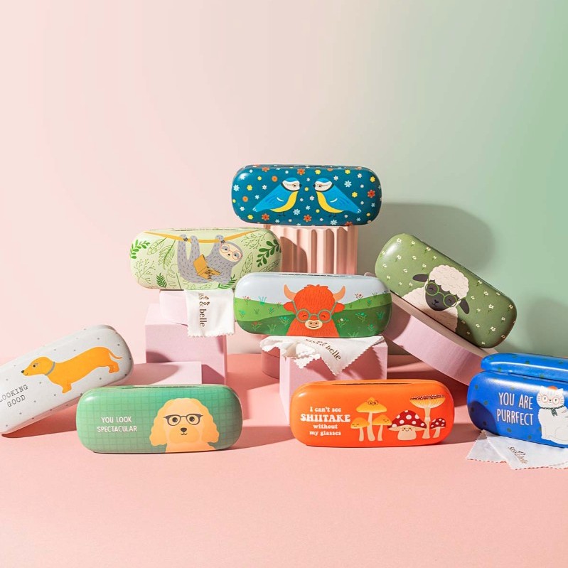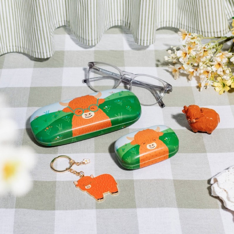 Snyggt glasögonfodral med motiv av highland cattle från sass & bell.