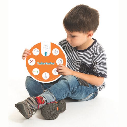 Hjulet är dubbelsidigt och kan vridas så att barnet enkelt kan peka och visa vad som känns i kroppen. Det stärker både kroppsmedvetenhet, kommunikation och känslomässig förståelse – hemma, i förskolan eller hos läkaren.