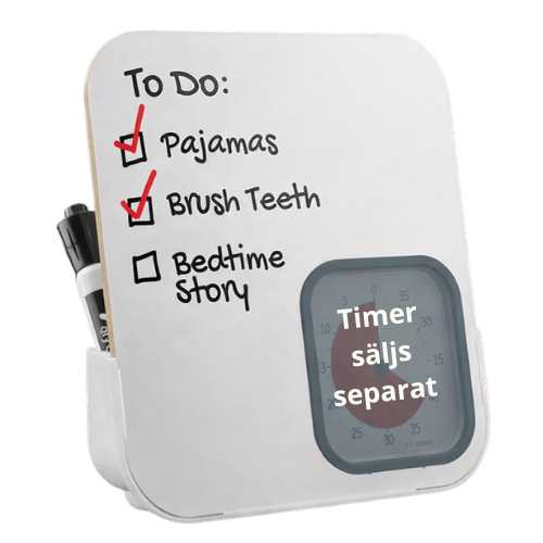 Whiteboardtavlan gör det möjligt att samla tid och uppgifter på ett ställe. Det är en idealisk lösning för barn och vuxna som har nytta av visuell stöd i samband med läxor, undervisning, möten, pauser och dagliga rutiner.
