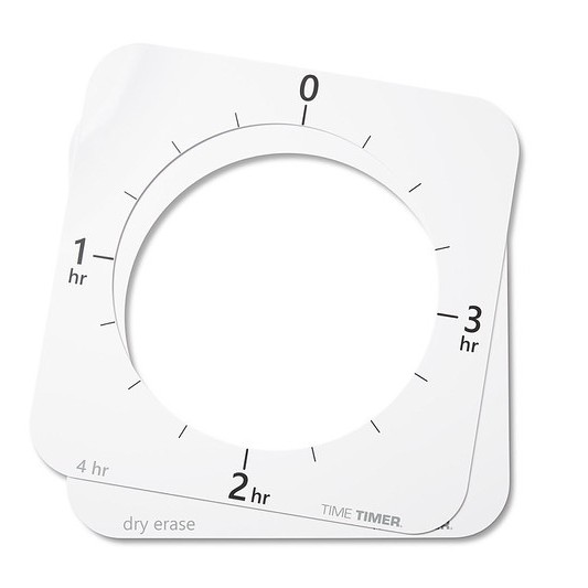 En av de bästa funktionerna med Time Timer Original MAX (utöver den extra stora synligheten) är möjligheten att anpassa timern efter olika behov. Dessa extra urtavlor gör det möjligt att använda de längre tidsinställningarna som MAX erbjuder: 4 timmar, 8 timmar och 24 timmar. Paketet innehåller även en extra blank whiteboardyta (dry-wipe), så att du kan skriva och sudda med en whiteboardpenna.