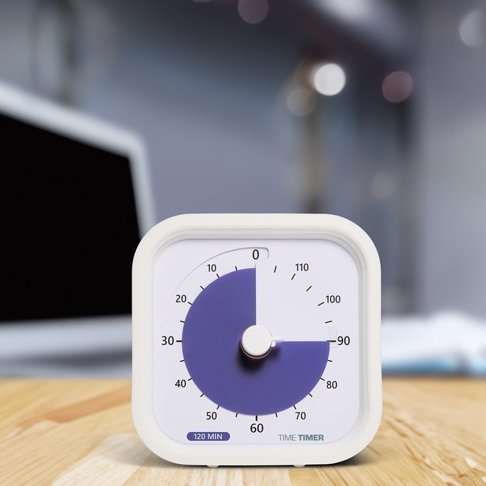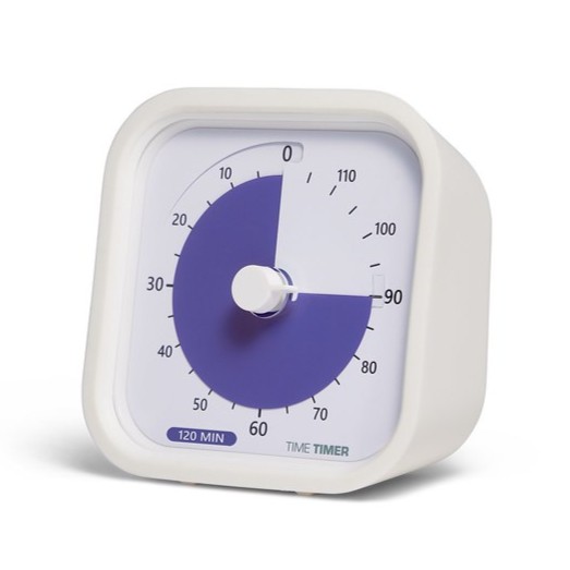 Time Timer är känd för sitt enkla, visuella sätt att visa tid. I stället för siffror som räknar upp minskar den lila skivan gradvis, så att man tydligt kan se hur mycket tid som är kvar. Det skapar trygghet, minskar stress och stärker självständigheten – även utan att kunna klockan.