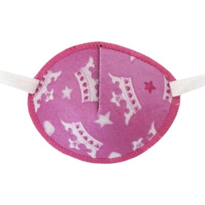 En ögonlapp av tyg med resår för barn som skelar. Den är ljusrosa med prinsesskronor och heter Tiaras. Den har elastik som sätts runt huvudet för synträning. Märket är Kay Fun Patch.
